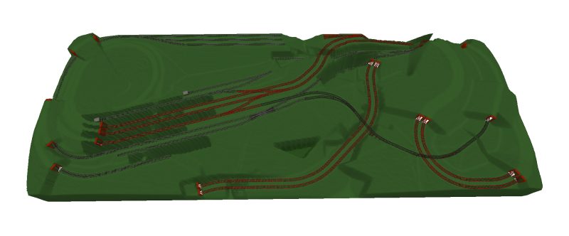 Die 3D Darstellung basiert auf einer Rekonstrucktion an Hand des Schaltpults. Fotos und auch den Original Gleisplan habe ich nicht mehr. Die Grundfläche war 95 zu 150 cm. Die Stichbahn war als einzige noch nicht gebaut, der Rest war funktionsfähig. Im linken Tunnel der zweigleisigen Strecke befand sich eine Wendeschleife mit Schattenbahnhof.